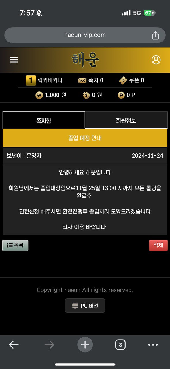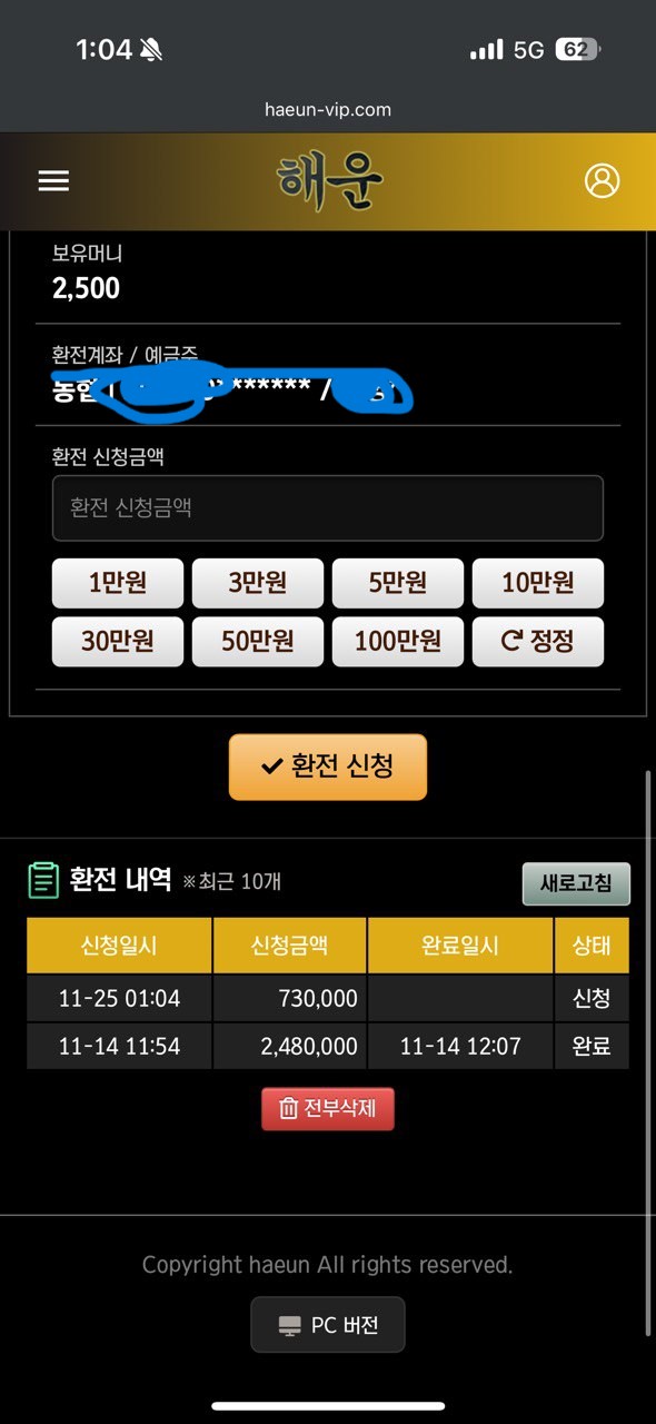 꾸준히 30에서 50 사이로 충전하며 이용해왔고, 248만원을 환전받았습니다. 하지만 그 이후로 계속 손해만 보다가 23일에 배팅했더니 아무런 설명 없이 배팅 취소를 반복하더군요. 그러다 졸업시킨다면서 다음 날 오후 1시까지 롤링을 채우고 환전받으라고 했습니다.
