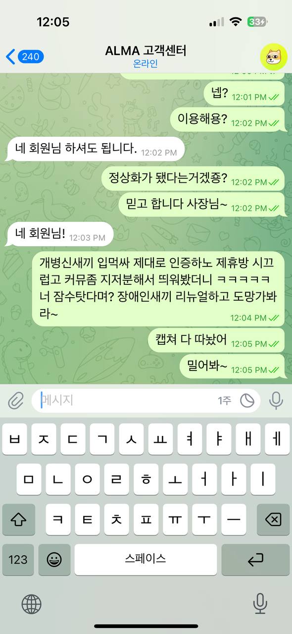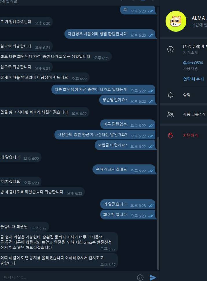 주말에 룸살롱 가서 신나게 놀 생각에 50만 원을 충전해 191만 원을 만들었습니다. 환전 신청했더니 처음에는 가상 계좌 오류라며 환전을 미루더군요. 2시간이 지나도 아무런 진행이 없어 다시 문의하니, 이번에는 "디도스 공격으로 충환전 시스템이 오류"라는 말을 하며 회피합니다.