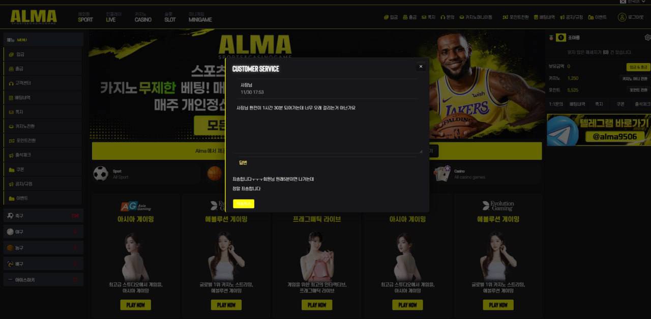 회원들을 농락하는 이런 악질 사이트는 처음 봤습니다. 적은 자본으로 운영하며 회원 돈으로 돌려막기를 하고, 하루 동안 환전을 묶어두고 핑계만 늘어놓더군요. 친구 계정으로 문의해봤더니, 그 계정은 아무 문제 없이 이용 가능하다는 대답을 합니다. 환전 버튼도 없는 상태에서 회원들에게 버티기를 강요하는 모습이 정말 역겹습니다.