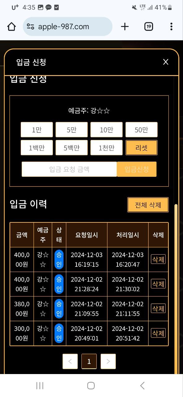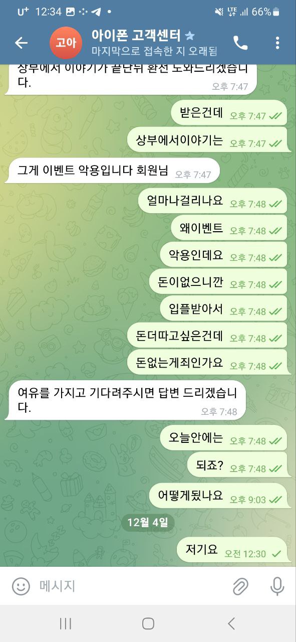 결국 텔레그램은 읽십하다가 사이트는 서버 점검이라며 막아버리더니, 점검 후 사이트에 들어가 보니 환전해 준 척 승인 처리만 해놨더군요. 이후 텔레그램으로 문의하려 했지만, 이미 차단되어 있었습니다.