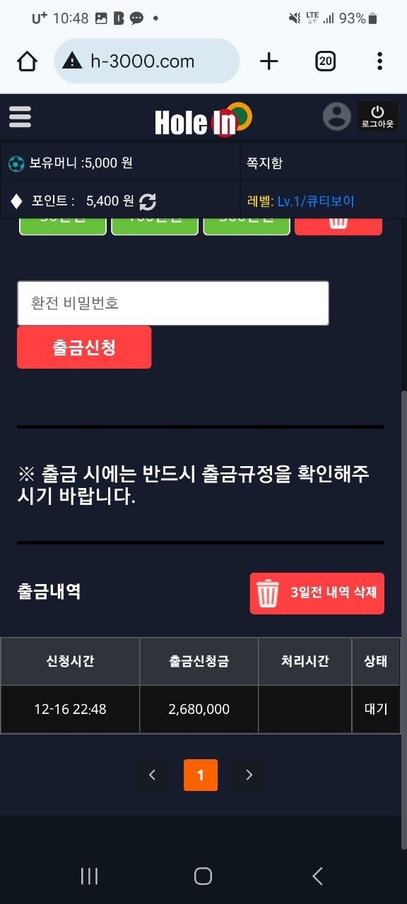 파워볼로 보유금액 268만 원까지 만들고 환전 신청을 했는데, 환전이 취소되더니 아니나 다를까 양방 배팅이라며 원금만 준 뒤 계정을 차단해버리네요.