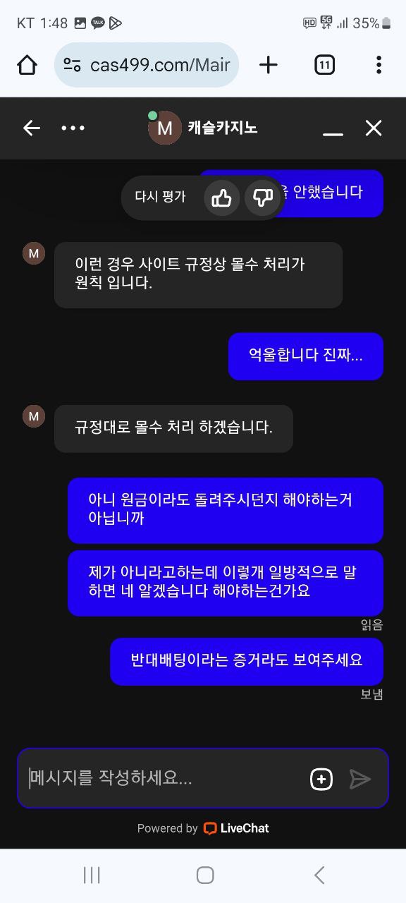 반대 베팅 의심으로 에볼루션 측에 문의 중이라는 이유로 2주가량의 대기 시간이 필요하다고 해서 기다렸습니다. 쪽지를 통해 답변을 주겠다는 약속을 믿고 매일 확인했지만, 아무 소식이 없어 결국 채팅으로 문의했습니다. 그러자 그제서야 반대 베팅으로 몰수 처리되었다는 답변을 받고, 곧바로 계정 차단을 당했습니다. 심지어 로그인하지 않고 채팅으로 문의해도 메시지를 읽고 채팅방을 떠나버리며, 증거를 요청해도 대화가 이어지지 않았습니다. 이런 말도 안되는 이유로 먹튀하는 사이트는 피하시는 게 좋습니다. 결국 원금조차 돌려받지 못했습니다.