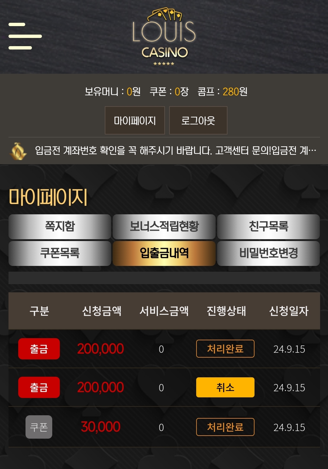 루이카지노에서 추석 쿠폰을 사용하라는 문자를 받고, 규정을 철저히 지키며 1000% 롤링을 달성하고 20만원을 만들었습니다. 그러나 출금 신청 후 시재 부족이나 블랙등의 이유로 계정이 정지되었습니다. 이럴 거면 왜 홍보 문자를 보내는지 이해가 되지 않네요.