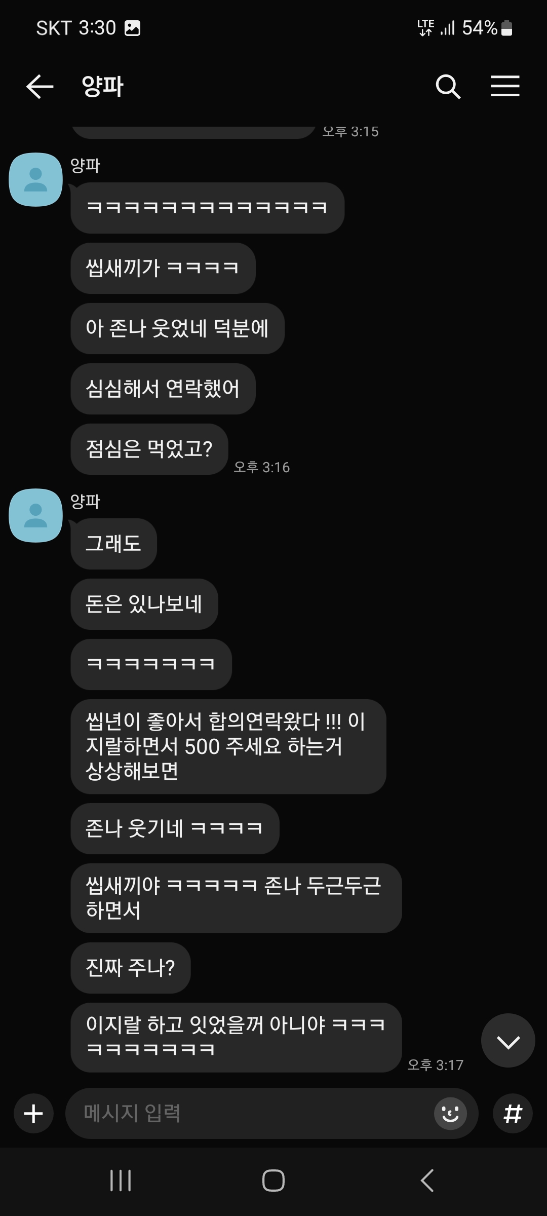 파워사다리 양파라는 곳을 보고 가입했는데, 저한테 욕하는 카톡도 방금말한 양파 카톡입니다. 먹튀당한 후에는 가상계좌 지급 정지 신청을 했고, 합의금 500만원 얘기는 먹튀당한 금액을 돌려달라는 말이었는데, 결국 결론은 이 꼬라지입니다.