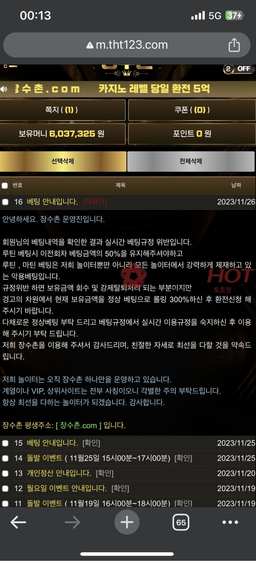 참고로 제재사항 없는 마틴 가능 사이트였습니다 그런데 갑자기 규정 위반이라는 이유로, 경고 차원에서 600만원의 300% 롤링 조건을 채우면 환전해주겠다고 하더군요.