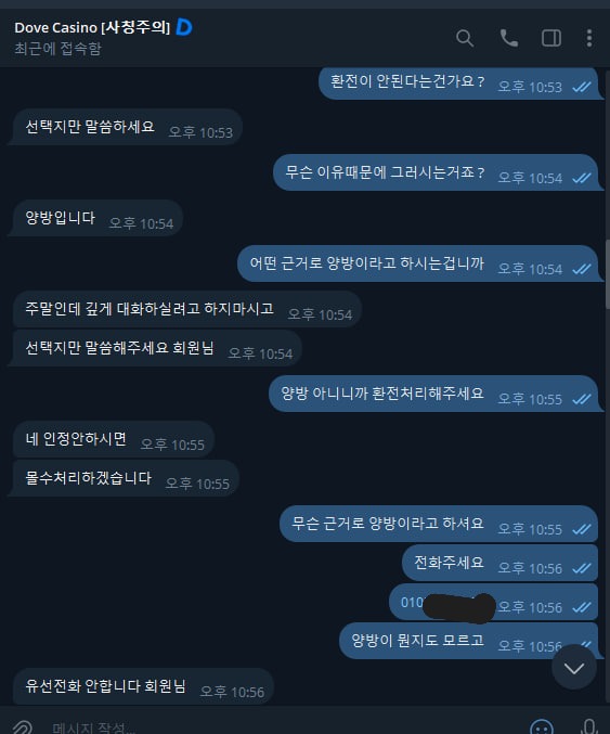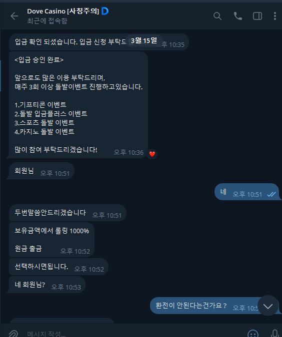 우연치않게 텔레 소통방에 들어가서 파울티비란 커뮤니티가 있길래 거기를 통해 도브카지노란 곳을 가입했습니다. 20충전을 하여 입금 플러스 20퍼를 받고 구간이 좋아 연달아 이겨서 158만원이 됐습니다. 기쁜 마음으로 환전 신청 눌렀으나 5초만에 다시 보유머니로 돌아와서 뭐지? 하려던 찰나에 텔레로 연락 달라고 하여 연락을 드렸으나 거기 관계자가 원금만 받고 갈래 롤링 1000프로 돌릴래 협박을 하기 시작하였습니다.