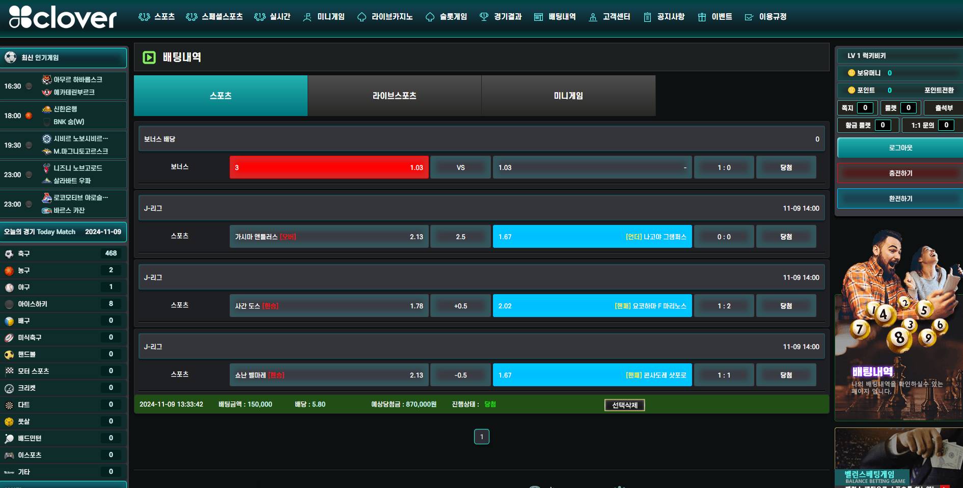 J리그 나고야 2.5언, 요코승, 그리고 삿포로 0.5 핸디 승으로 총 3폴 10만원을 걸어 87만원 당첨됐습니다.
