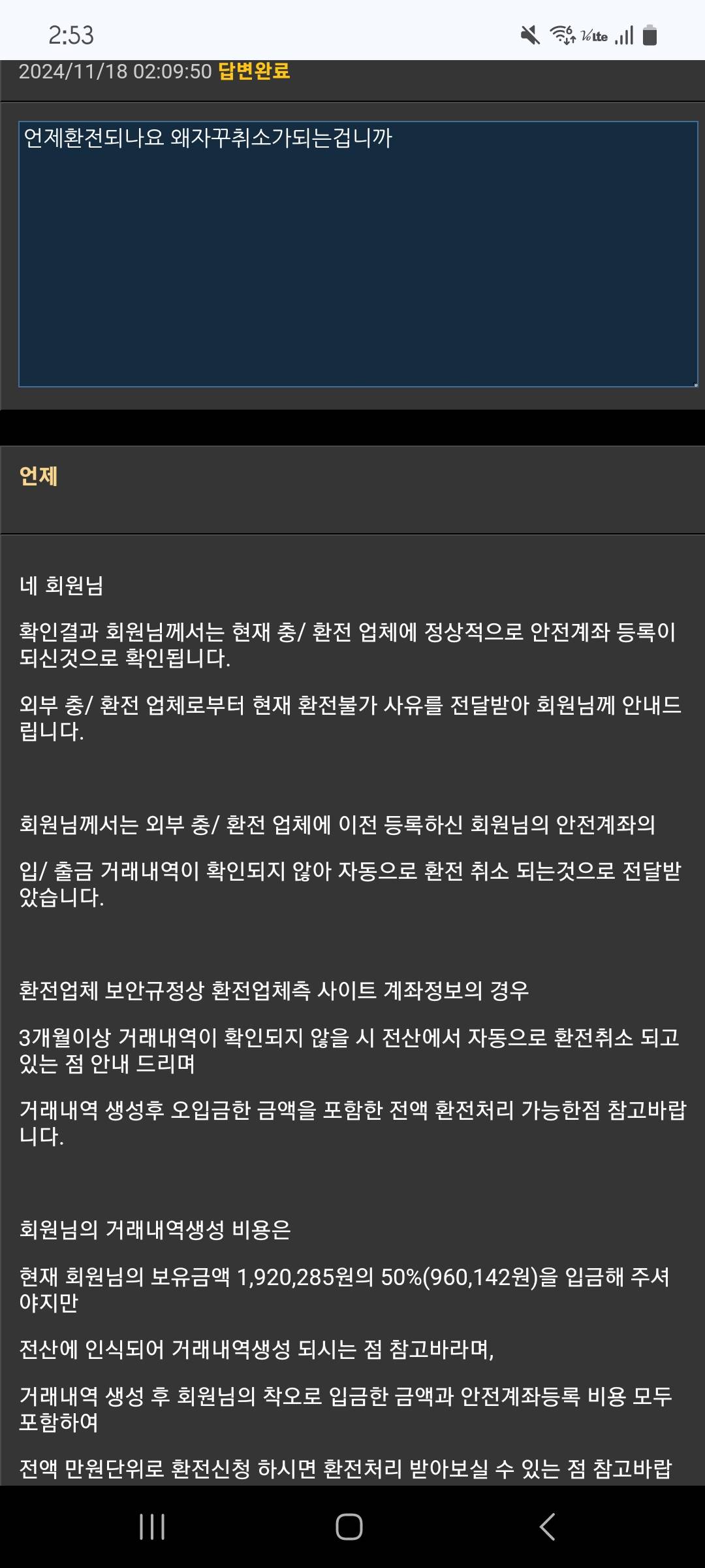 문자로 사이트가 합병되었다는 연락을 받고, 남아있던 보유 포인트로 올인 배팅을 했습니다. 나중에 확인해보니 배팅이 적중해서 약 90만 원의 포인트가 생겼습니다. 기쁜 마음으로 환전 신청을 했고, 고객센터에서 계좌 등록을 위해 39만 원을 입금하라는 안내를 받았습니다.