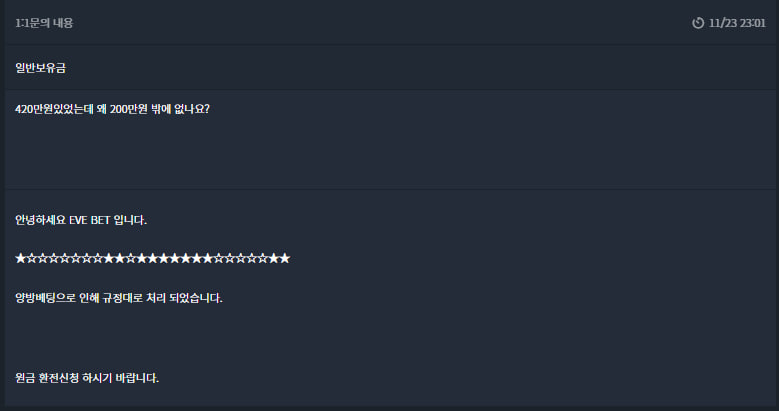 토토지식백과를 보고 가입해서 한 달 정도 이용했는데 어이없게 먹튀당했습니다. 경기 시작 후 취소를 때리더니, 당첨금을 몰수하고는 원금만 들고 나가라는 통보를 받았습니다.